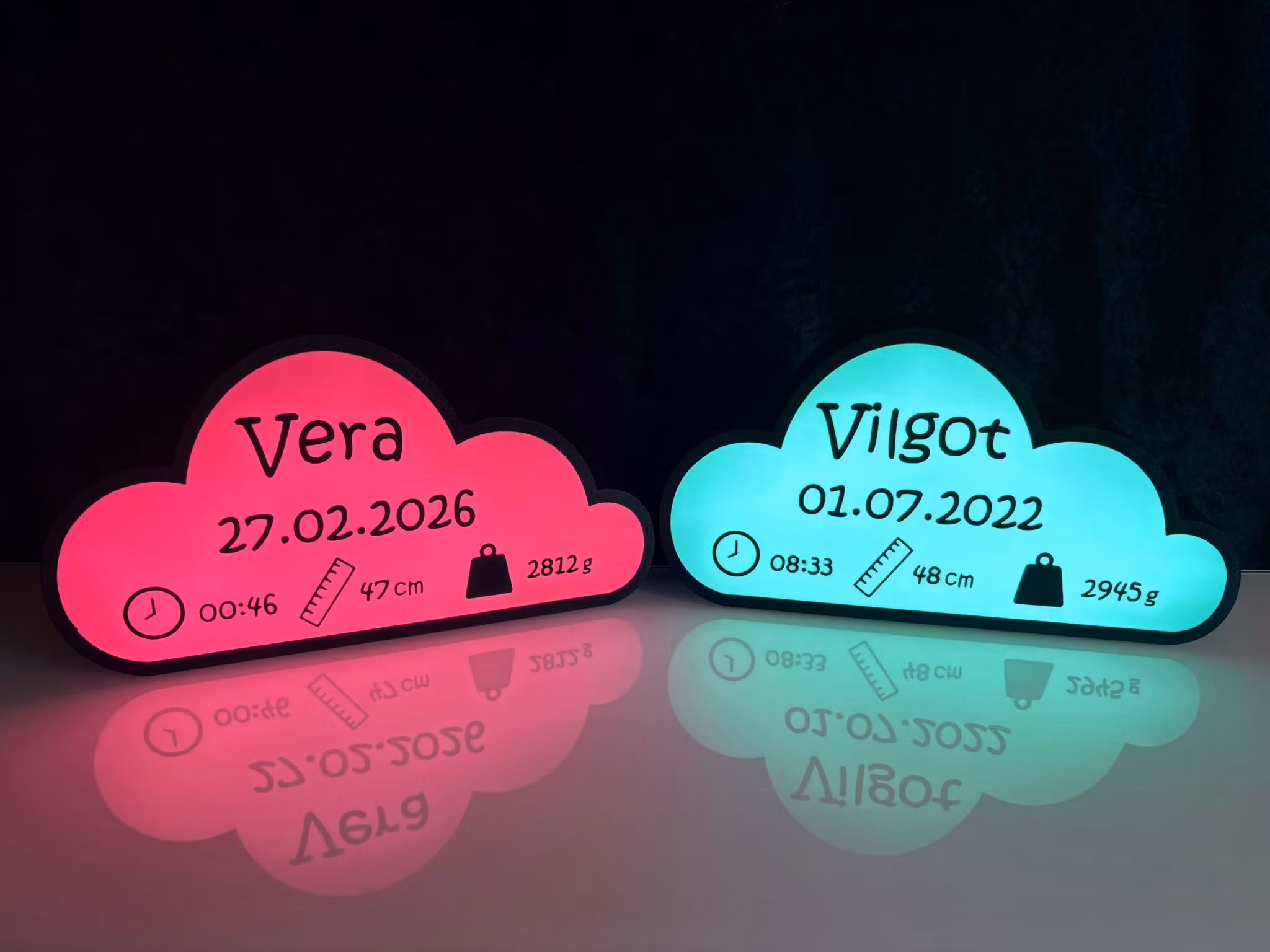 Varje lampa anpassas med barnets namn och födelsedetaljer, såsom datum, tid, längd och vikt – en fin och personlig inredningsdetalj som också blir ett minne för livet.