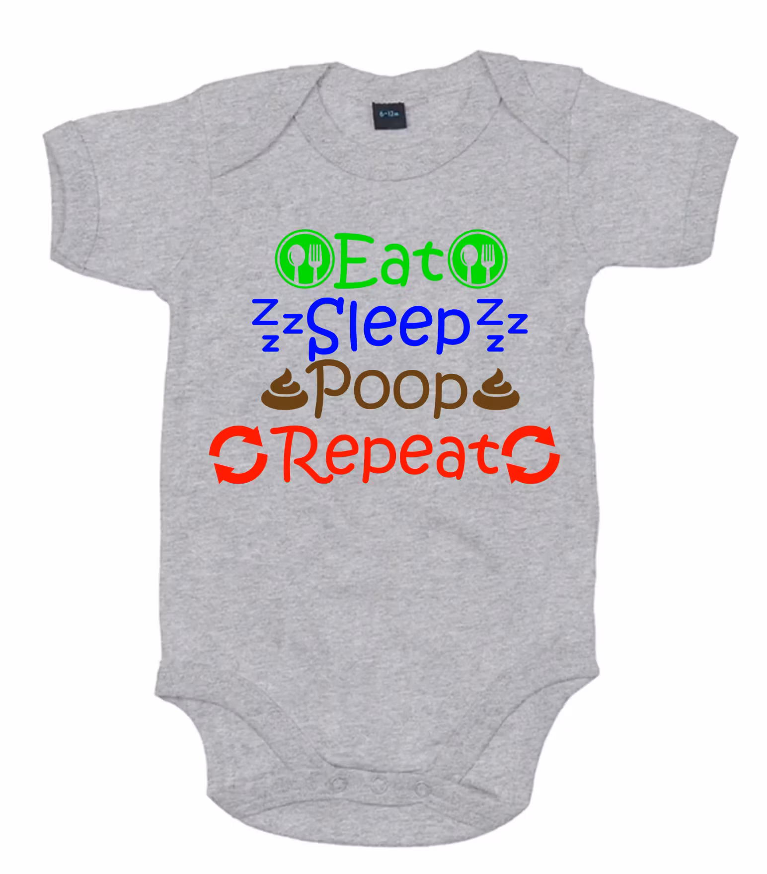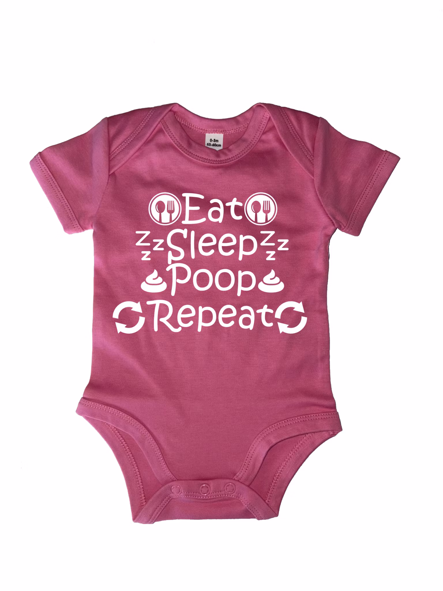 Denna personliga babybody med trycket “Eat Sleep Poop Repeat” är en rolig och minnesvärd detalj för den lilla nykomlingen.
